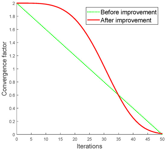 Figure 2. Compared with the linear convergence factor, the improved nonlinear convergence factor has improved the global search ability in the early stage and the local search ability in the later stage. At the same time, the global search time is increased, the local search time is reduced to balance the two search capabilities of the algorithm and the efficiency of the algorithm is improved as much as possible under the same number of iterations.