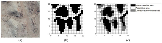 The working environment models of path planning include grid maps, vector maps, point cloud maps and so on. As the most widely used environmental model, a grid map has the advantages of simplicity and intuition, so a grid map is used as the environmental model of the obstacle-crossing robot.