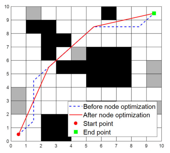 The generation and optimization steps of the path are as follows: (1) At the beginning of the generated path, a random node is first generated by a chaotic sequence in each row between the starting point and the end point of the map, and all nodes are placed in the path in order as a grey wolf individual. (2) After generating the individual, the connection between the individuals may pass through the black impassable area, so the intermediate value is inserted in the middle of each two nodes through a specific interpolation program so that the path is continuous and does not pass through the obstacle. (3) Although the interpolated path can guide the robot to move from the starting point to the end point without obstacles, the path often has redundant inflection points and too large corners, so it is necessary to perform node optimization operations. The basic logic of the node optimization operation is when the connection between two points does not pass through any impassable area, and the path cost of the connection between two points is less than the original path cost, the original path is cleared and replaced by the connection between two points, as shown in
