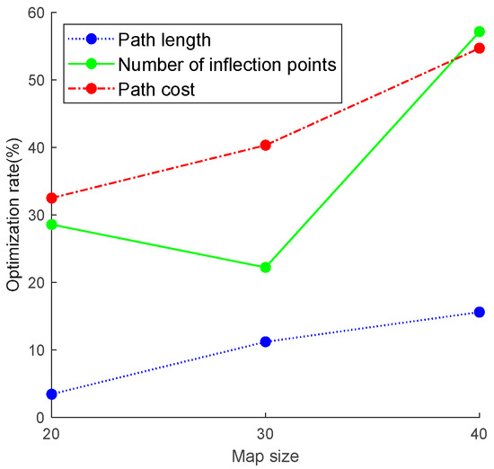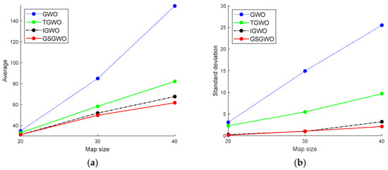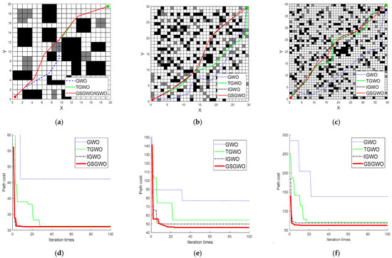 Figure 9 can be calculated. It can be seen that compared with the GWO, the path length planned by the GSGWO in 20 × 20, 30 × 30 and 40 × 40 maps is optimized by 3.45%, 11.2% and 15.6%, respectively, the number of inflection points is optimized by 28.57%, 22.22% and 57.14%, respectively, and the path cost is optimized by 32.5%, 40.32% and 54.69%, respectively. Although the randomness of the map environment has a certain influence on judging the change rule of the data, the overall optimization rate increases with the increase in the complexity of the map. At the same time, the rotation angle of the path planned by the GSGWO and the stability of the algorithm are also optimized to a certain extent. The feasibility of the path-planning field of the GSGWO obstacle-crossing robot is proved.