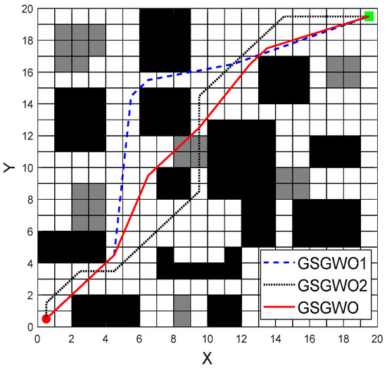For the subsequent improvement and application expansion of the GSGWO, the following ideas are proposed: (1) Adaptive adjustment of and . The preliminary idea is to extract map features such as map size, number of obstacles, average obstacle size and starting and ending positions. The mathematical relationship between these features and and is analyzed through experiments. Finally, the values of and are calculated by establishing a mathematical equation between the features and and . If the adaptive adjustment of and can be achieved, the GSGWO will be able to process new maps through a small map processing program, and robots equipped with the GSGWO will be able to perform tasks in areas that have never been explored. (2) Enrich the types of obstacle-surmountable passage areas. In the actual scene, there are many kinds of obstacle-crossing robots that can cross obstacles, and the ways and costs of obstacle-crossing are not the same. By classifying the obstacle-crossing areas into roadblocks, slopes, gullies, grasses, etc., it can make the GSGWO more intelligent in path selection and reduce the probability of accidents.
