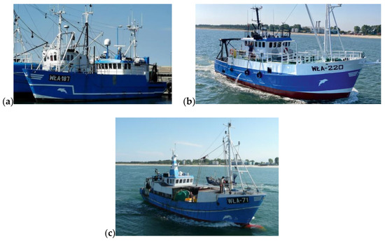Fishing boats used in research (years 2019–2023): (a) WŁA-187, (b) WŁA-220, and (c) WŁA-71. Source: courtesy of Necfish Co.
