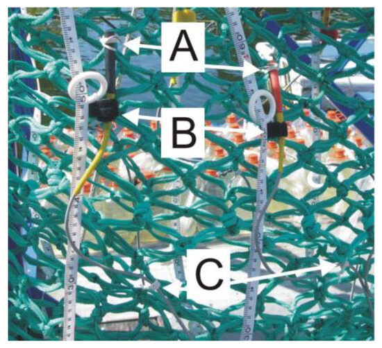 The net of a tested codend with ultrasonic transducers installed (black transmitter, red receiver) with (A,C)—permanent fastenings to the net fabric; (B)—pass-through fastening.