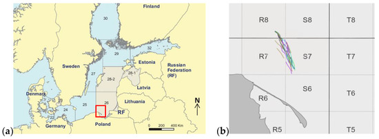 The research fishing was conducted in traditional cod fishing grounds of Polish fishermen located north-east of Władysławowo harbour, i.e., in the ICES area 27.3.d.26 (South-Eastern Baltic) comprising Polish administrative fishing squares R7, R8, S7, and S8 (see Figure 6) at depths ranging from 44 m to 90 m. The duration of one trawl was 1 h (from the end of running out the trawl set to the start of retrieval) with a trawling speed of approximately 3 knots (1.5 m/s).