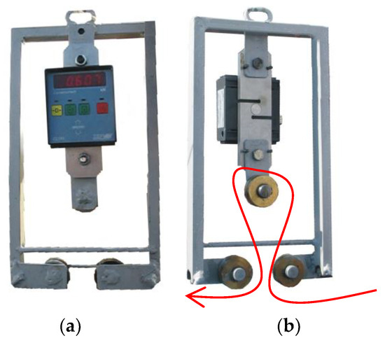 The station for measuring tension of the line closing the sleeve: (a) front view; (b) rear view.