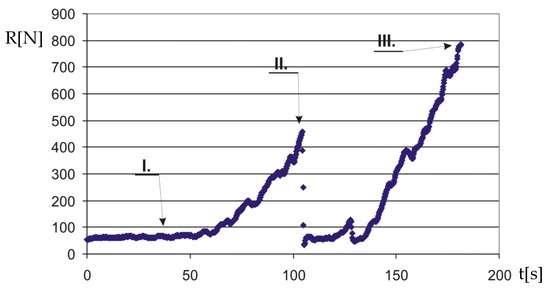 Looking at Figure 12 and Figure 13, in phase I, the rope closing the inner sleeve of the cover is pulled in. One can see that the tension force on the rope begins to increase. This proves that the stopper (twine connector) is being tightened, and it breaks after about 100 s, when the tensioning force drops rapidly (phase II). In the next stage, the drag begins to increase again, which indicates that the inner sleeve in the fine-mesh divided cover is closing. When the drag value increases to approximately 800–1000 N, then the inner sleeve has been tightly closed—this guarantees the separation of fish that will start to leave the codend in the process of hauling the trawl set from those that left it earlier, i.e., during towing. The retrieving time depends on the length of the closing rope and the speed of pulling in. Therefore, the moment of breaking the stopper and closing the sleeve should be determined on the basis of the force gauge readings.