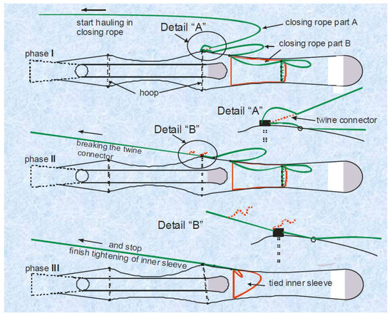 Phases of the codend’s cover inner sleeve tightening.