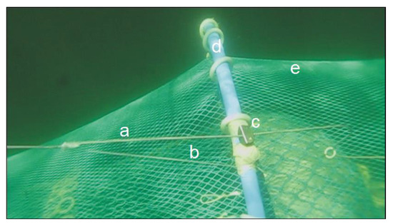 Arrangement of the cover’s inner sleeve closing: a—closing rope, b—stopper, c—clamping jaw (cleat), d—plastic ring, and e—fine-mesh DOD of a codend.