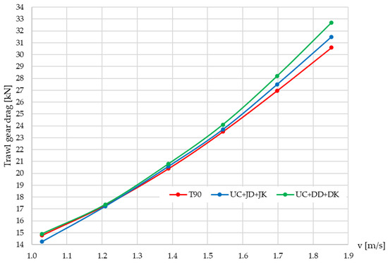 The drag of three variations of trawl sets with codends T90, UC + JD + JK, and UC + DD + DK.