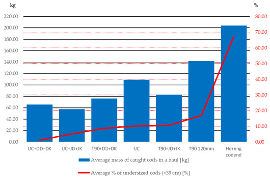 In Figure 16, the means are shown for both catch mass (blue columns refer to the left vertical axis) and selectivity % (red line refers to the right vertical axis) in one haul. The average percentages of undersized cod which were caught using various codend variants were as follows: