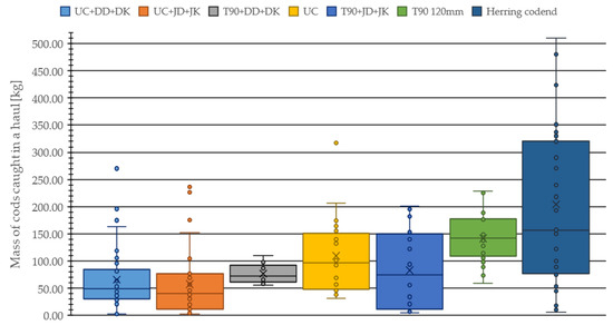 A box and whisker plot was used to present selectivity in terms of the mass of a catch and % of undersized cod graphically.