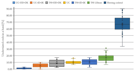 Percentages of undersized cod caught with UC + DD + DK codend and non-selective herring codend by double bottom trawling in 2023.