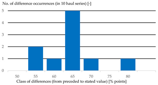The mean difference between the percentage of undersized cod caught by the UC + DD + DK codend and non-selective herring codend using double bottom trawls in 2023 was 61.7% points with an SD of 8.4% points. The distribution of the frequency of measured differences allocated into 5% point classes (see Figure 19) has not been validated due to the low sample number (the number of comparative hauls by double bottom trawling was 10), but one can assume that there is no or negligible correlation between percentages of undersized cod with the UC+DD+DK codend and the non-selective herring codend as correlation coefficients of Pearson and Spearman are, respectively, 0.09 and 0.05 (a relationship such as a higher percentage for the non-selective codend and a higher percentage for the selective one does not exist—the variables do not tend to change together at either a constant or a non-constant rate).
