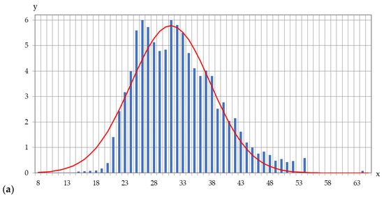 Figure 20a,b additionally shows the results of Baltic cod length measurements made in 2023 from hauls with a herring codend without any selectivity (10,587 individuals measured). The x-axis represents 57 classes of cod length (from 8 to 65 cm long, clustered every 1 cm); the y-axis represents the class share [%] in the caught cod mass.