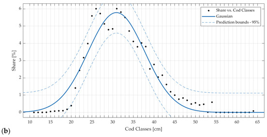 The distribution of caught cod classes fits well a Gaussian model equivalent to a normal PDF given by Equation (1):