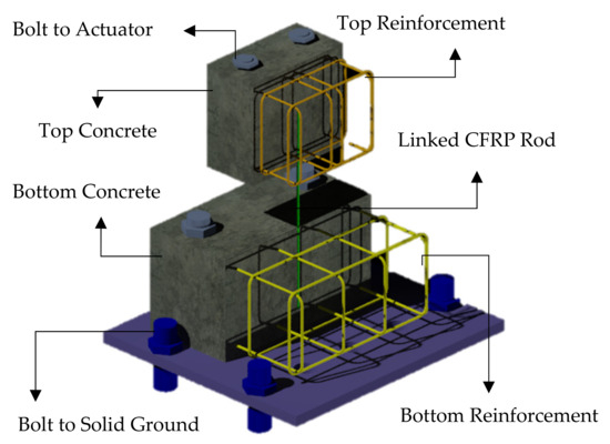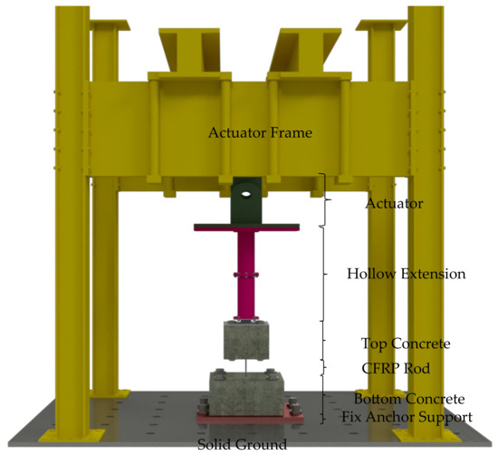 The initial design for a double pull-out test for G40 concrete and UHPFRC prototypes was conducted under a cyclic loading actuator, as illustrated in Figure 9. The concept involves a CFRP rod embedded in both the top and bottom concrete blocks. The bottom concrete was fully restrained on the ground using bolts and nuts, while the top concrete was attached to a dynamic actuator that performed the pulling action.
