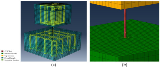 (a) Mesh of Concrete; (b) CFRP rod mesh as a 3D element with 15 mm mesh size.
