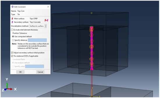 To compare the commonly assumed “Tie” interaction between CFRP and concrete found in most literature studies with the newly developed interface element investigated in this article, two numerical models were constructed. One interaction scenario involved embedding CFRP rods directly into the concrete without utilising an interface element, while the other employed an interaction definition based on analytical results and stiffness values derived from experimental data. The interaction between CFRP bars partially embedded in both concrete segments required a distinct approach, namely, partitioning. Since CFRP is considered an external reinforcement to concrete, full embedment akin to conventional reinforcement is not viable; however, perfect bonding between CFRP and concrete is essential. Consequently, for the CFRP–concrete interaction, the concrete section was partitioned into four pieces, and the externally extruded hole for CFRP was sealed. The Tie interaction between these segments was implemented with the surface-to-surface discretisation method (Figure 4). This approach allows the CFRP bar to exhibit behaviour consistent with testing and material properties within the concrete layers. Additionally, Table 8 summarises the contact behaviour parameters. Similarly, for UHPFRC and normal G40 concrete, the same modelling and simulation approach was employed, with the only difference being the material properties.
