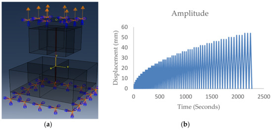 The boundary conditions were applied by fixing the bottom concrete in all directions and restraining the top concrete in the x- and y-directions while allowing movement along the z-axis with upward loading (Figure 5a). A load displacement of 5 mm was applied with a tabular amplitude to define the cyclic behaviour of the displacement loading. Displacement control loading was employed, wherein displacements were applied rather than directly applying loads to the model. The amplitude shown in Figure 5b represents a cyclic test conducted in compliance with ASTM standards to investigate the model’s behaviour under applied axial loads using displacement control at an amplitude of 2 mm. force–displacement data were developed adhering to the ATC-24 code [23].