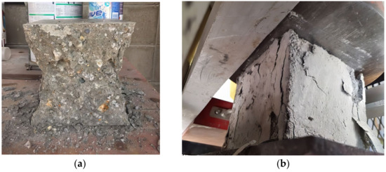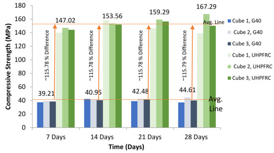The evaluation of concrete compressive strength is crucial for ensuring the structural integrity of construction materials. The global standard BS EN 12390-3:2002 [26] emphasises the rigorous methodologies employed in this assessment. Adhering to precise specimen dimensions, calibrating compressive testing machines with specified failure load parameters (20% to 80% of full scale), and maintaining a stringent ±1% relative error tolerance are critical aspects of the compressive strength testing process [27,28]. The compressive mechanical test was conducted using a MATEST (MTS) machine. The compressive stress trend up to the first crack was observed for all the specimens and continued with full failure. According to BS EN 12390-3 “Typical Failure Mode of Test Specimen”, G40 concrete exhibited a semi-explosive failure mode (Figure 11a), while UHPFRC displayed a more robust, non-explosive failure mode (Figure 11b). This characteristic is more desirable for structural applications [26]. Ultra-High-Performance Fibre-Reinforced Concrete (UHPFRC) demonstrates significantly greater strength than conventional concrete. It undergoes a rapid evolution of mechanical properties over time, achieving high early-age strength and stiffness, with a short-term hydration regime that is nearly complete within 90 days [20]. Experimental tests on UHPFRC have revealed substantial improvements in both compressive and flexural strengths [29]. The mechanical test results for G40 concrete and UHPFRC are presented in Figure 12. UHPFRC specimens were found to be more elastic, with 90–95 percent of the compressive strengths remaining elastic after strain hardening up to the maximum peak strength. This behaviour, however, is not consistently observed in all UHPFRC specimens and is related to the interaction between the steel fibres and the binder matrix. The ultimate outcome is ductile failure, and the concrete surfaces remain smooth even after strength loss.