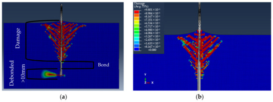 Furthermore, the damage evolution was also considered as linear displacement with a total displacement of 1 mm. This implies that if the bonding at the CFRP–concrete interface exceeds 1 mm, the test is deemed to fail at that point. Additionally, the viscosity is also 1 mm. The normal behaviour was assigned as a rigid “contact”, and the tangential behaviour at the CFRP–concrete interface was considered with a friction coefficient of 0.75. The shear stress was specified as 3.9 MPa and the elastic slip was considered as 0.00001. Notwithstanding the general contact that was previously defined, the surfaces of the CFRP that are embedded in concrete will adhere to the cohesive behaviour and are considered exceptions to the general contact to have their own behaviour. Ultimately, the simulation was conducted on two 2D six-node specimens, one with the interface element that was analytically obtained and the other without an interface element. The maximum stress in Figure 23a indicates that the CFRP rod performs optimally with UHPFRC, with the bonding holding up until the CFRP material itself fails. On the other hand, the displacement results also show that the maximum displacement occurred in the CFRP material while the UHPFRC was also deformed (Figure 23b). The damage propagation in G40 concrete is shown in Figure 24a. The interface at the CFRP has been compromised by 80%, including the tip of the CFRP rod at the inside of the embedded region. The minimal bonding area is caused by angular and coarse aggregate that interlocks with the CFRP, but it is not satisfactory because the debonding exceeds 1 mm. On the other hand, the damage propagation in UHPFRC reveals robust bonding with minimal damage compared to G40 concrete. Notably, no debonding is apparent, attributed to the ductility and interlocking performance of UHPFRC with CFRP rods (Figure 24b).