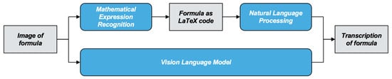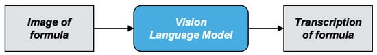 However—to the best of our knowledge—there is no work that tackles the problem of transcribing mathematical formulas in images. Figure 1 illustrates the two possible processes for transcribing mathematical formulas. In the first approach, the image of the formula is converted into LaTeX code using mathematical expression recognition (MER) [2,3,4,5,6]. This LaTeX code then serves as input for a natural language processing (NLP) model, which produces the transcription of the formula. In the second approach, the image of the formula is converted into its transcription using a vision-language model (VL), which is able to combine image analysis and text generation [7].