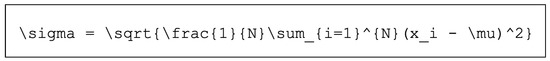 - Retrieve a complete transcription that covers the whole formula, “sigma is equal to the square root of one divided by n times the sum from i equals one to n of xi minus mu squared”).