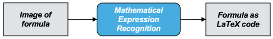OCR, i.e., the transcription of normal printed texts in documents and videos, has been extensively studied, e.g., [12,13]. However, conventional OCR systems are not able to process mathematical expressions in documents or images due to the formulas’ special structure, symbols and the position of the formulas’ elements [14]. Therefore, as demonstrated in Figure 4, a specialized mathematical OCR system—called mathematical expression recognition (MER) in literature—is required to convert mathematical content into markup languages such as LaTeX [14].
