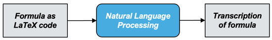 In the automatic transcription of mathematical formulas, challenge 1 and challenge 2 are usually handled using MER models, which convert the image of the formula into LaTeX code [2,3,4,5,6]. As demonstrated in Figure 3, LaTeX code usually contains commands such as \lim, \sum, and \frac. These commands still have to be converted into natural language. NLP models have the potential to perform this conversion.