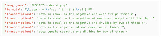 Since there was no existing dataset that covered the whole pipeline from the image of the formula as input to the final transcription as output, we created a new dataset called Formula2Text, which is publicly available in our GitHub repository (https://github.com/ficht74/Formula2Text, accessed on 21 January 2024). Formula2Text is based on the existing dataset IM2LATEX-230K [8], which we reduced, cleaned, and augmented with English transcriptions.
