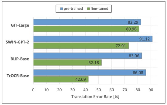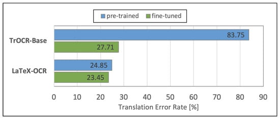 Figure 10 visualizes the performances of the analyzed MER models in terms of TER. The blue bars show the performances of the original pre-trained models. The green bars represent the performances of the models that we fine-tuned using the Formula2Text validation set. We observe that the fine-tuned LaTeX-OCR achieves, with 23.45%, a notably lower TER compared with the fine-tuned TrOCR’s TER of 27.71%, which is 18.16% relative.