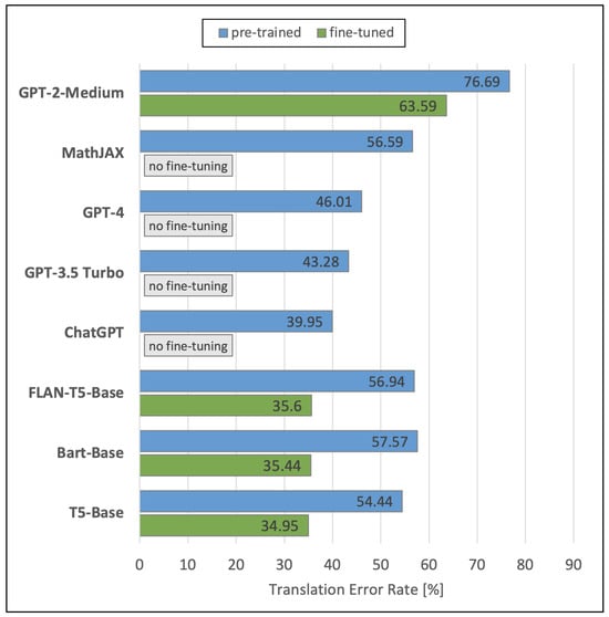 To create transcriptions from LaTeX codes, we evaluated seven NLP models plus the online service MathJAX (https://mathjax.github.io/MathJax-demos-web/speech-generator/convert-with-speech.html, accessed on 21 January 2024) by comparing their resulting transcriptions with the transcriptions in the references of the Formula2Text test set. Figure 11 visualizes the performances of the analyzed NLP models in terms of TER. The blue bars display again the performances of the original pre-trained models. The green bars show the performances of the models that we fine-tuned using the Formula2Text validation set. Fine-tuning was not possible for ChatGPT, GPT-3.5 Turbo, GPT-4, and MathJAX at the time of our experiments from mid March to mid August 2023.