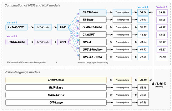 Figure 13 presents the TERs of the combinations of our MER models and our NLP models in comparison with the TERs of our VL models. Our goal was to discover which combination leads to the lowest TER for the complete pipeline of transcribing mathematical formulas in images. In the case of the combination of MER and NLP models, an NLP model receives as input the erroneous output of an MER model. The TER of the MER model LaTex-OCR is 23.45% (Variant 1). The TER of the MER model TrOCR-Base is 27.71% (Variant 2). The combinations of LaTex-OCR and the investigated NLP models are colored in blue, while the combinations of TrOCR-Base and the investigated NLP models are colored in purple. In the case of the VL models, there are no combinations with other models and no intermediate steps that provide erroneous input.