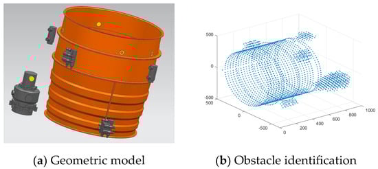 Most scholars studying pipe routing algorithms assume that the routing space is already known. This is true for some simple ship and aero-engine models. Because simple geometric models can be concatenated with a small number of containment blocks, obstacle recognition can be easily and quickly achieved. However, for geometric models with complex components, it is very difficult and time-consuming to obtain the routing space. Therefore, scholars adopt various schemes to describe the obstacle. There are primarily two types of obstacle description methods: cell decomposition (Figure 1a) and hierarchical decomposition (Figure 1b). Cell decomposition is the process of decomposing a 2D or 3D model into cells of the same size and shape. By determining the presence of obstacles in each cell, it identifies whether the pipeline can pass through. This method is widely used in traditional routing algorithms [5]. Cell decomposition demands an adequately fine grid during grid scanning to accurately depict the routing space. However, using fine-grained grids can raise concerns related to storage and computational time. For instance, the aero-engine model with the size of presented in Figure 2. Figure 2 is partitioned into grids based on various sizes, as depicted in Table 1.