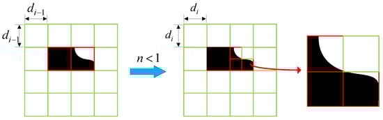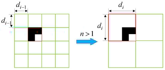 As shown in Figure 4, the adaptive grid decomposition method is illustrated. When the value of n is greater than 1, the adjacent grids in the original grid system are examined. If there are obstacles present within these original grids, the corresponding new grid is considered obstructed and marked with a red rectangle. Conversely, if the original grid is free from obstacles, the corresponding new grid is considered unobstructed and represented by a green rectangle. When n < 1 (Figure 5), the original grid will be disassembled into grids for judgment. If there are obstacles in the original grid, the new grids need to be identified. If the original grid is unobstructed, the new grid is considered unobstructed. This process helps identify and differentiate obstructed and unobstructed regions within the routing space.