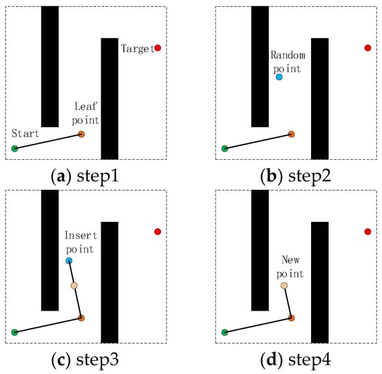 The RRT is an incremental random sampling-based path search algorithm that can quickly find a collision-free path within the search space. In recent years, it has been widely applied in various fields and has demonstrated practicality. The RRT algorithm consists of four steps (See Figure 7). ① At the beginning, the RRT algorithm only contains the start points, some path points, and goal points. ② Secondly, computing the position of the node nearest to the random sample point. ③ Thirdly, extending a new node from the nearest node to the random sample point. ④ Fourthly, the length of the branches grown is determined by a predefined step size. RRT uses a global random sampling method to explore its directions. It ensures that the probability of expanding each node is related to the area of its Voronoi region, resulting in RRT always expanding the node in the largest surrounding empty space. This helps evenly cover the entire search space.