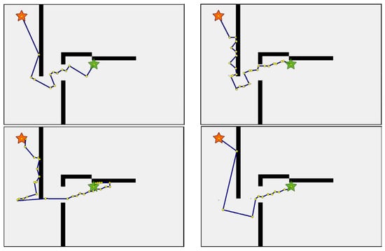 To generate the initial population for the genetic algorithm, the RRT algorithm is executed multiple times (four times, listed in Figure 8) to obtain paths with the same start and goal positions. These resulting paths are discretized into spatial nodes, which form the initial population for the genetic algorithm. This approach leverages the strengths of both the RRT algorithm and the genetic algorithm to enhance the efficiency of the overall pipe routing optimization process.