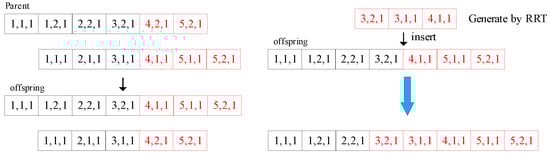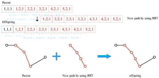 In this article, a single-point crossover operator is utilized. Previous studies often employed simple gene crossover strategies, resulting in many infeasible segments in the offspring individuals and the generation of numerous illegal solutions during the iterative process. To address these challenges, this article incorporates an evaluation step after a single-point crossover, as depicted in Figure 9. If the offspring contains gene points that cannot be directly connected, the RRT algorithm is employed to generate a new path between the two gene points.