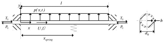 The pipe for establishing a numerical surrogate model for the natural frequency is shown in Figure 11. In Figure 11, the boundary conditions are the fixed support at both ends. The reason for using fixed supports at both ends is that cantilever pipelines are not allowed for aero engines. is the flow velocity inside the pipe and is the change in flow velocity. And, respectively, represent the axial force and represents the pressure of fluid inside the pipe. is the position coordinate along the length direction of the pipe; represents the force. represents the outer diameter of the pipe, and represents the thickness of the pipe. The nonlinear vibration equation of the pipeline is derived in reference [31], which is listed in Equations (4) and (5).