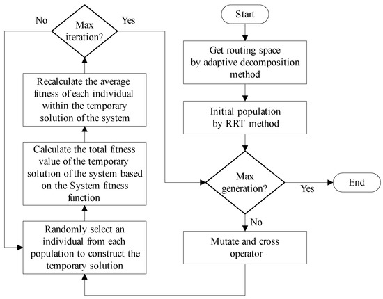 To overcome these limitations, this paper proposes a novel collaborative evolution method (See Figure 14). In Figure 14, the distinctive aspect of this method is highlighted in red, which sets it apart from other collaborative evolutionary algorithms. The approach involves N populations, each containing m initial paths obtained through the RRT algorithm. After acquiring the initial fitness values of each individual, the evolution proceeds sequentially based on the order of the initial populations. During population evolution, a path is randomly selected from each population, forming the temporary solution for the current system. The fitness value of this temporary solution is evaluated using Equation (3). This process is repeated k times to obtain the average fitness value and update the fitness values of each individual. The above evolutionary process continues until the maximum number of generations is reached.