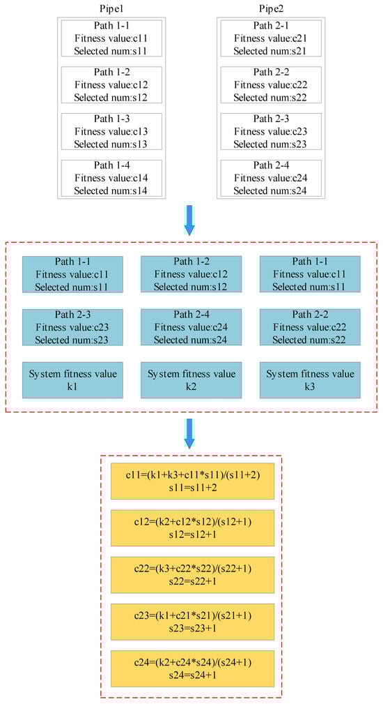 Figure 15 is the detailed diagram of two pipes in the red part of Figure 14. Figure 15 is a pipe system with two pipes. The population number of each pipeline is 4. First, record its current fitness function and the number of times selected. Then, randomly select a path from each population and repeat it for k times (k = 3 in Figure 15) to form a temporary solution of the pipe, evaluate the temporary solution of the system according to Equation (3) (such as k1 in Figure 15), obtain the average fitness value of the pipe, and start the next update.