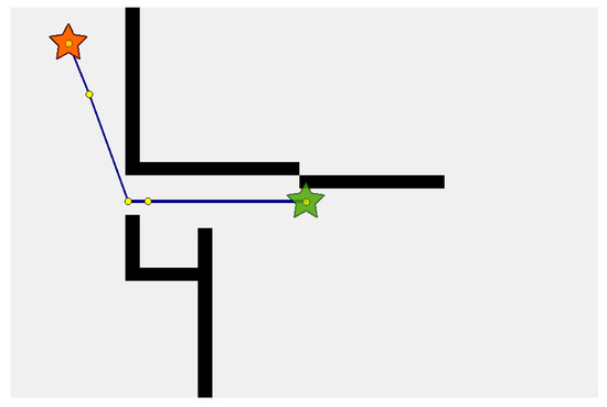 In addition to the four mutation operators mentioned above, this article proposes a new mutation operator (Figure 10). Figure 10 is a random mutation case. Figure 10 is used to demonstrate the operation process of RRT-based random mutation. We are introducing the RRT algorithm at the gene point of mutation operation, starting from the gene at the mutation site and ending at the endpoint, to find a new RRT path to insert the original gene segment. The design of these operators is crucial for the effectiveness of the genetic algorithm.