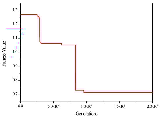 The statistical results are shown in Table 4. Figure 16 is the result of case study 1. Figure 17 displays the fitness curves of the simulations. In Figure 16, the minimum segment occurs between the second and third support points with a distance of 30 mm. Case study 1 shows the pipeline’s centerline obtained by the routing algorithm, not the 2D model of the pipeline. In case study 1, the turning radius issue was not considered; only the pipeline’s centerline was displayed. From Figure 16, it can be found that the proposed method can meet the requirements and ensure collision avoidance between the layout environment. This article takes into consideration the natural frequency of the longest segment and optimizes the support positions while planning the path. During the optimization process of the support positions, the distance between two support positions must meet the specified requirement, which in this case is a minimum distance of 30 mm. According to the data in Table 4, the natural frequency of the longest segment is 8079.57 Hz, the total length is 239.6 mm, the convergence value of the evaluation function is 0.71161, and the convergence is reached after 825 generations.