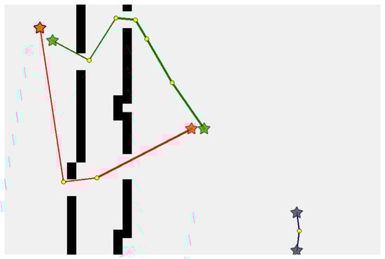 A routing space is depicted in Figure 16 with several obstacles. The routing space is a rectangular area measuring 400 * 300 mm2. The obstacles are represented by black rectangles. The red and green stars indicate the starting and ending points of the pipe. The evaluation function factors are as follows: , , , and the minimum length requirement is set to . The pipe material is 0cr18ni9 with a radius of 20 mm and a wall thickness of 0.2 mm. The natural frequency surrogate model factors are , , and . The number of the initial population is 5. The blue line represents the path of pipe. Additionally, the yellow dots indicate the specific positions along its route where the pipe should be supported.