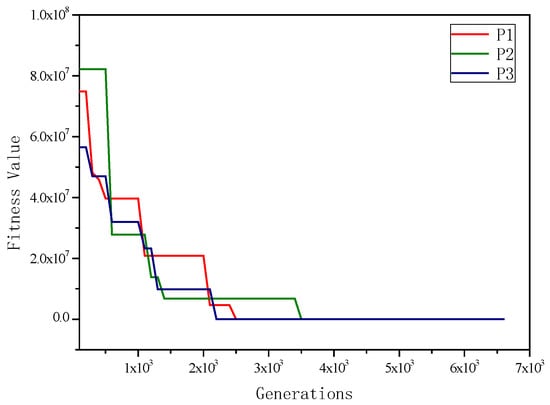 After validating the correctness of routing a single pipe, further validation of the algorithm for multiple pipes was conducted. The environment and simulation results are presented in Figure 18. In this particular case of the multi-pipe routing algorithm, there are three pipes and each pipe has an initial population of 5. The parameters used in this case are the same as in case 1. The fitness value of the current optimal path is outputted every 10 generations. The fitness curves of the simulations are shown in Figure 19. At the beginning of the iteration, the evaluation function has a relatively high value due to the issue of initial paths of several pipelines crossing each other. As the iteration progresses, the phenomenon of intersecting disappears, resulting in a rapid decrease in the fitness value until convergence. The results are summarized in Table 5. In Figure 18, the red, green, and blue lines represent the centerlines of pipes P1, P2, and P3. It can be observed from Figure 18 that the multi-pipe algorithm proposed in this paper effectively achieves obstacle avoidance among multiple pipes in complex environments. By considering the natural frequency of the longest straight segment and the shortest segment in the evaluation function, the path planning result is no longer solely focused on achieving the shortest path. From Figure 18 and Table 5, it can be observed that the total path length of the red pipe is 650.2 mm, with the shortest segment length of 79.7 mm, which exceeds the set constraint of 30 mm. The natural frequency of the longest segment is 2686.6 Hz, and there are two clamp support positions. Convergence is achieved after 2520 generations. The total path length of the green pipe is 544.6 mm, with the shortest segment length being 46.7 mm. The natural frequency of the longest segment is 20,862.5 Hz, and there are five support positions. Convergence is achieved after 3510 generations. The total path length of the blue pipeline is 77.8 mm, with the shortest segment length being 43.4 mm, the natural frequency of the longest segment being 46,053.8 Hz, and having one support position. The convergence algebra is 2200 generations.