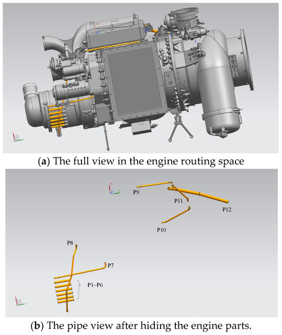 After these pretreatments, the pipes can be arranged by following steps: (a) extend the pipe nozzles outward by 8 mm; (b) search the path of the current pipe with the proposed algorithms; (c) smooth the route to allow for actual processing. In Example 3 of this article, the fillet radius of all the pipelines is 3 mm. Figure 21a shows the full view of the engine routing space. Figure 21b shows the pipe view after hiding the engine parts.