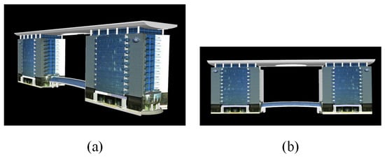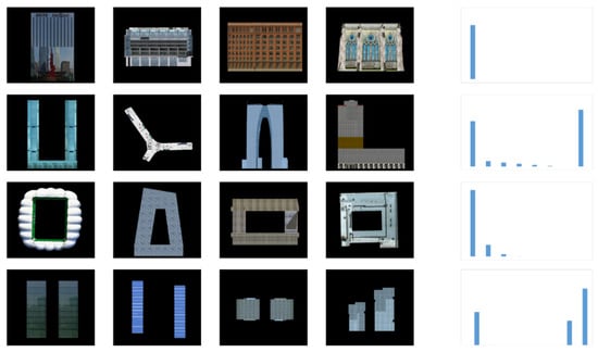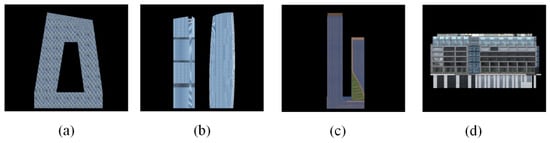 Subsequently, considering that the views with significant topological features are primarily located on the top or side views of the model, this paper firstly divided the landmark building model into 16 shapes by combining the 4 topological structures of the top view and the 4 topological structures of the side view in pairwise combinations. Since some of the combinations cannot exist in reality or the number collected did not meet the requirements, we ultimately selected six categories of 3D topological structure models as the subsequent experimental dataset. The various categories of models are shown in Figure 3.