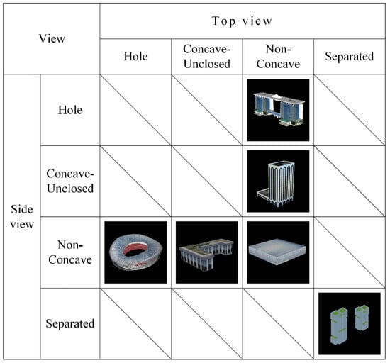 Model categories: top view is non-concave, side view is a hole; top view is non-concave, side view is concave unclosed; top view is non-concave, side view is non-concave; top view is hole, side view is non-concave; top view is concave unclosed, side view is non-concave; top view is separated, side view is separated.