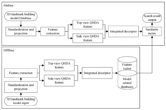 Consistent with common 3D models, 3D landmark building model retrieval can be divided into two distinct stages: online retrieval and offline retrieval, as depicted in Figure 4.