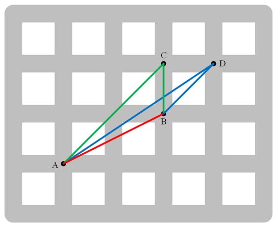 In theory, when establishing the voting interval, the inner distance in a non-concave plane is expected to be equal to the Euclidean distance, resulting in a quotient distance of 1. However, since the image is composed of discrete points, the inner distance is limited by the tolerance, which leads to computations that do not follow a straight path on the image, resulting in a quotient distance typically exceeding 1. As an illustration, consider Figure 6: Each intersection represents a pixel centroid. Assuming that the tolerance is , the Euclidean distance from A to C is AC, the inner distance is AB + BC, and the quotient distance is the quotient of AB + BC and AC. Obviously, the quotient distance is not 1.